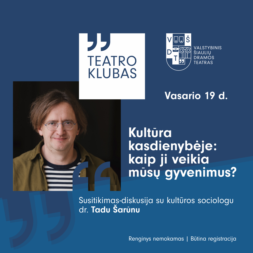 Pirmasis TEATRO KLUBO renginys vyks vasario 19 d. Tai – susitikimas su kultūros sociologu dr. Tadu Šarūnu. Diskusijoje „Kultūra kasdienybėje: kaip ji veikia mūsų gyvenimus?“ diskutuosime apie kultūros vertės sampratą šiuolaikinėje visuomenėje, kultūros politikos poveikį, skirtingus kultūrinius įpročius didžiuosiuose miestuose ir regionuose bei apie tai, kaip dalyvavimas kultūriniame gyvenime veikia žmonių gerovę. Sociologas taip pat pristatys naujausius kultūrinio dalyvavimo tyrimus ir kvies diskutuoti apie tai, kas lemia mūsų pasirinkimus kultūros lauke.