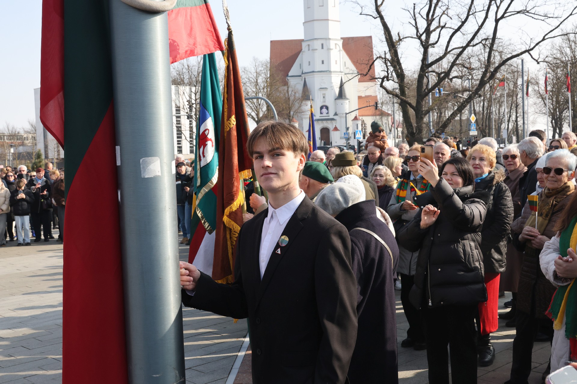 Garbė kelti Lietuvos valstybės vėliavą miesto širdyje patikėta Šiaulių universitetinės gimnazijos abiturientui Juliui Čepauskui chemijos, biologijos, ekonomikos ir verslumo olimpiadų miesto prizininkui.