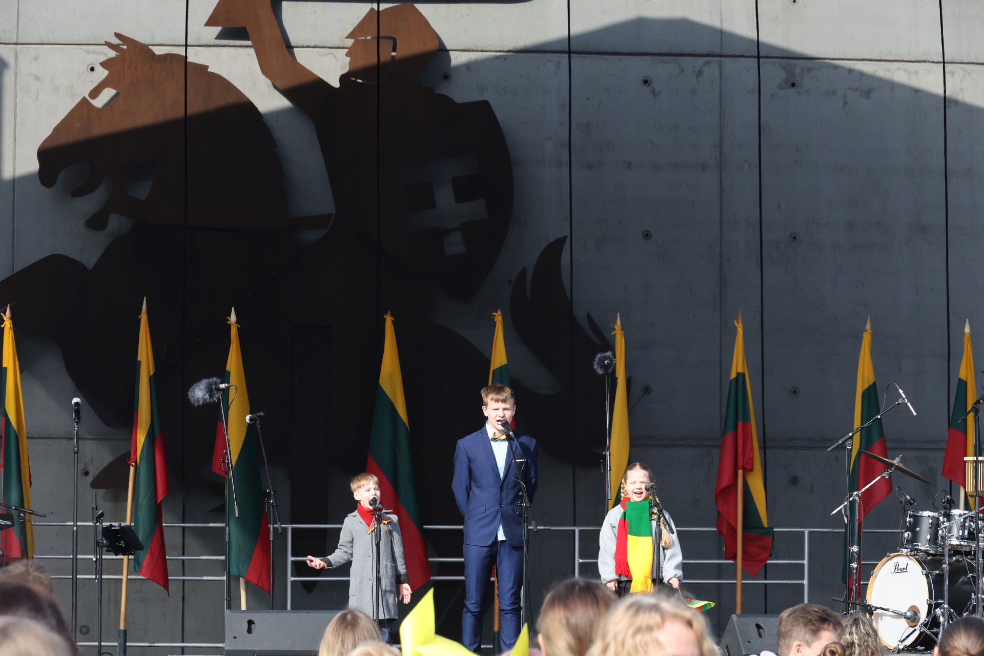 Tuo metu susirinkusieji aikštėje „Tautišką giesmę“ giedojo kartu su Šiaulių 1-osios muzikos mokyklos soliste Gabija Kumpyte.