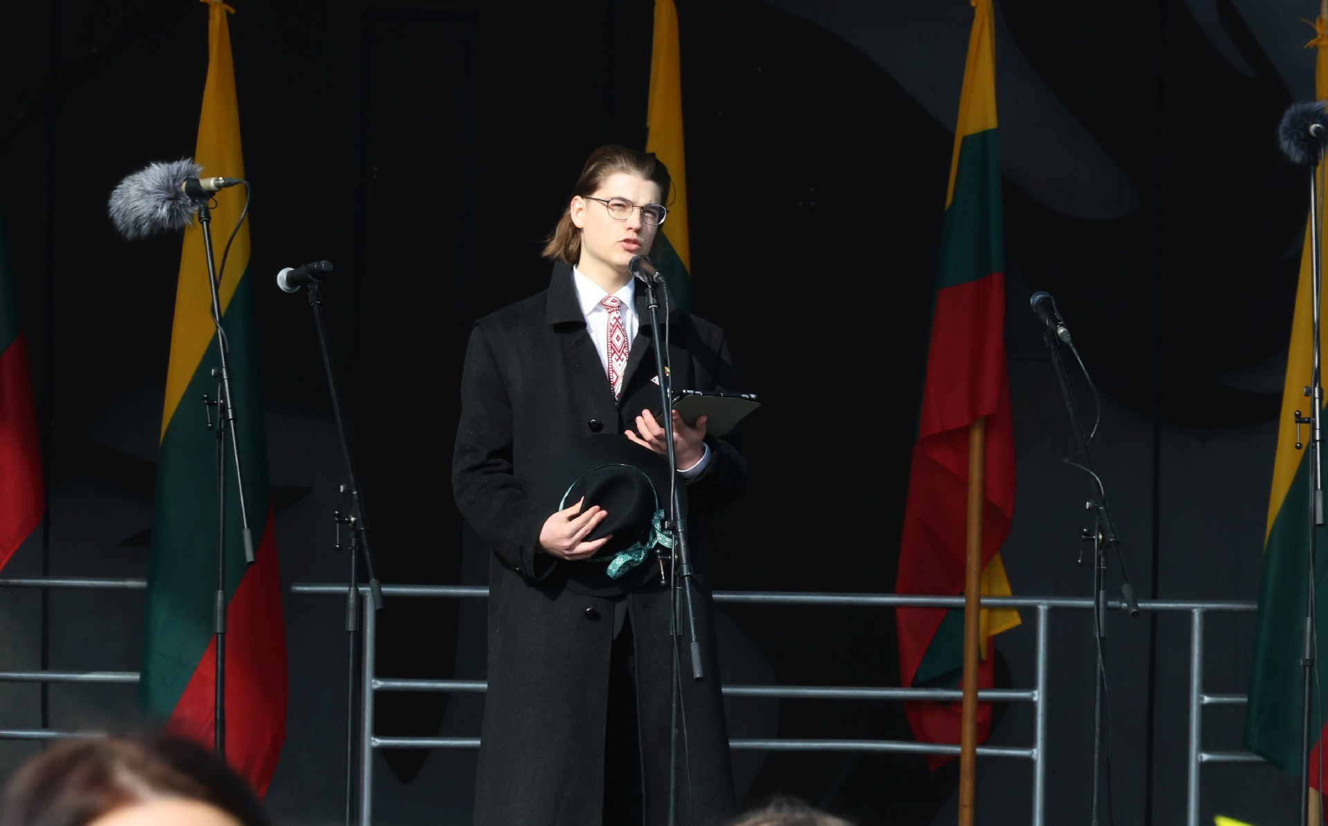 Sveikinimo žodį šventės dalyviams tarė net du jaunuoliai – Šiaulių „Romuvos“ gimnazijos abiturientas Kipras Spulginas ir Šiaulių Sauliaus Sondeckio menų gimnazijos abiturientas, pianistas Povilas Ušinskis.