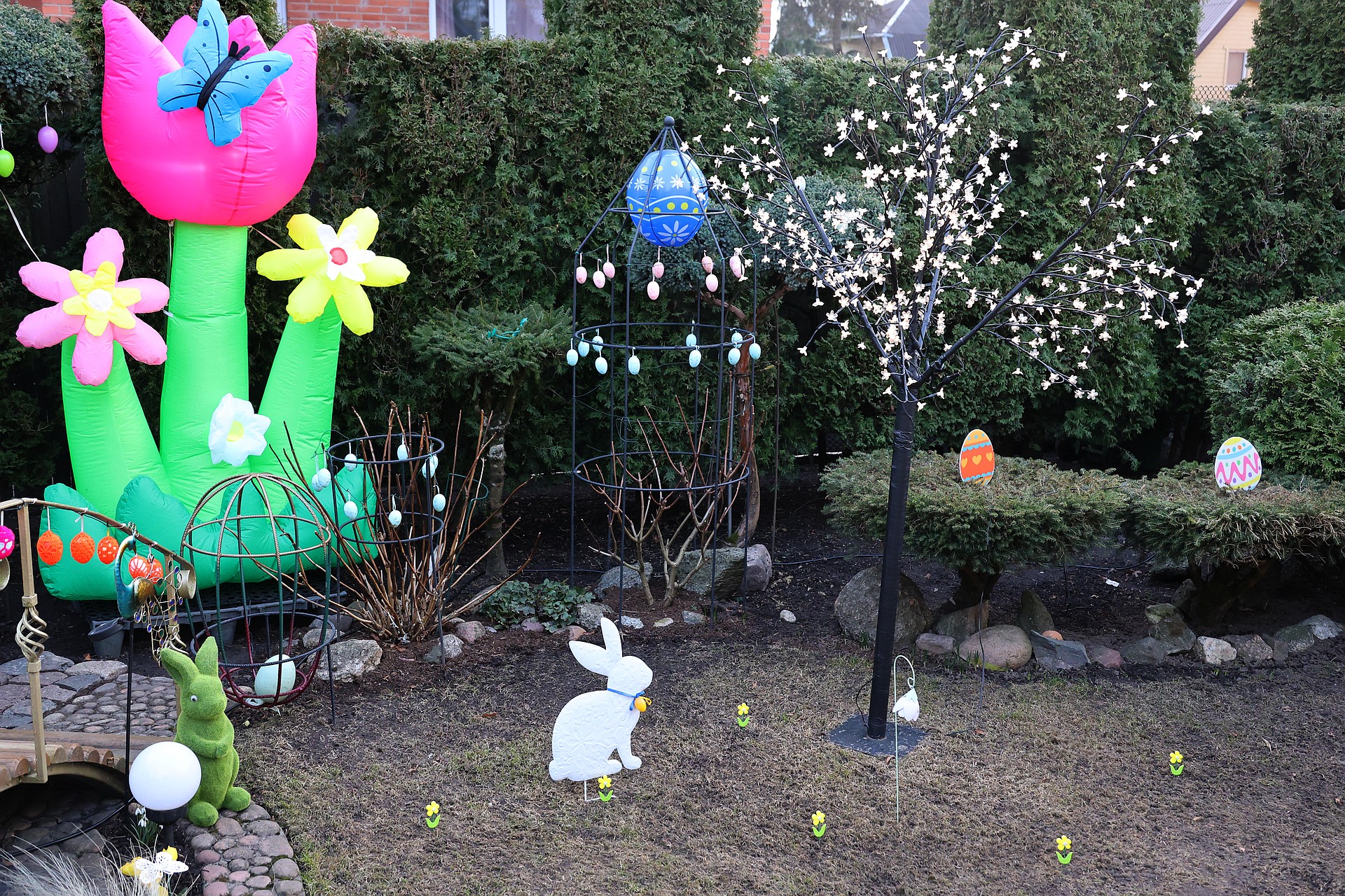 Kiškiai, gėlės, paukščiai ir, žinoma, gausybė įvairiausių dydžių ir spalvų margučių nustebins visus – ir vaikus, ir net suaugusius. Jonas ir Danutė pasakoja, kad puošti aplinką pradėjo jau baigiant tirpti sniegui, reikėjo skubėti, nes šiemet ankstyvos Velykos.