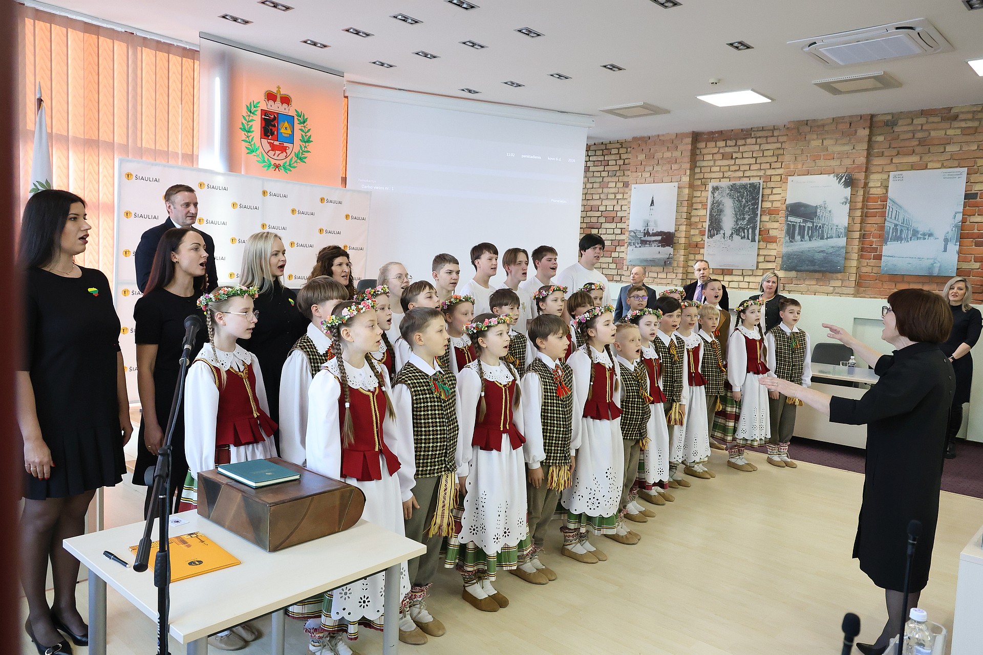 Šiaulių miesto tarybos posėdis prasidėjo „Tautiškos giesmės“ giedojimu. Šįkart kartu su Tarybos nariais himną atliko Metų mokytojos Laimos Kulšytės vadovaujami Jovaro progimnazijos ir „Ringuvos“ mokyklos moksleiviai.
