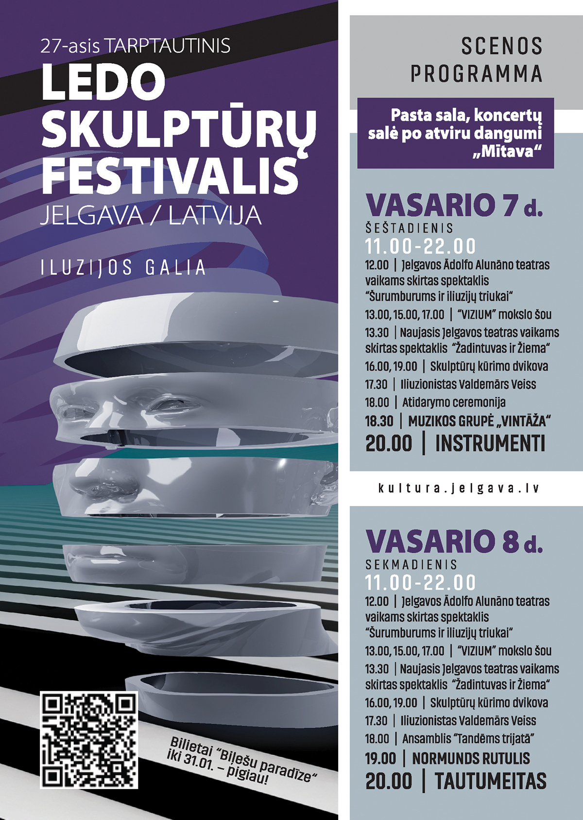 Šeštadienį vyks festivalio atidarymas ir ledo skulptūrų konkurso apdovanojimai, po kurių koncertuos grupės „Vintāža“ ir „Instrumenti“. Sekmadienį pasirodys „Tandēms trijatā“, Normunds Rutulis su Rygos orkestru, o festivalį užbaigs Eurovizijoje Latvijai atstovavusi grupė „Tautumeitas“.