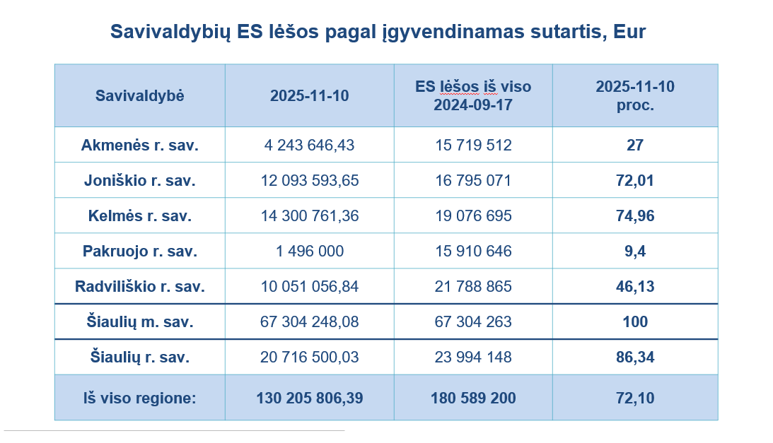 Akcentuota, kad šiuo metu Šiaulių miestas jau yra sudaręs finansavimo sutarčių už 67 304 248 eurus – tai sudaro 100 proc. Šiaulių regiono plėtros plane Šiaulių miesto savivaldybei suplanuotų Europos Sąjungos lėšų.