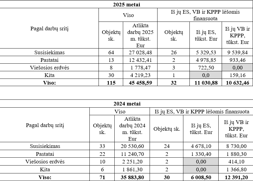 2024 m. savivaldybė turėjo 71 objektą, kuriems buvo panaudoti 36 mln. eurų, o 2025 m. – 115 objektų, kuriems išleista daugiau nei 45 mln. eurų. Taigi, 2025 metų rezultatas – beveik 10 mln. eurų didesnės investicijos į miestą. Tokių didžiųjų objektų, kurių vertė viršijo milijoną eurų, 2025 metais buvo net vienuolika.