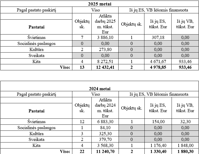 Pastatų segmente daugiausiai lėšų išleista švietimo srityje, kur iš 12,4 mln. eurų beveik 4 mln. išleista darželių, mokyklų, aikštynų ir kitų projektų tvarkymui. Visuose kituose objektuose padaryta darbų už 8,4 mln. eurų. Abejais metais investicijos buvo panašios – apie 12 mln. eurų kasmet.