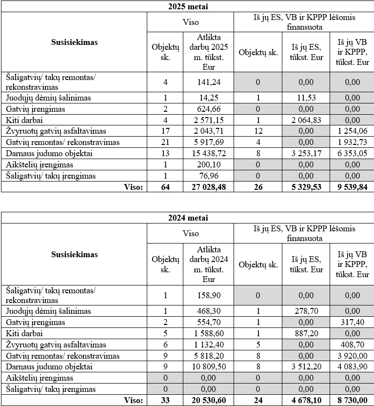 Atnaujinant susisiekimo infrastruktūrą, 10 mln. paskirta darbams dešimtyse didesnių ir mažesnių objektų, žvyruotų gatvių (17 atskirų atkarpų) asfaltavimui išleista daugiau nei 2 mln., darnaus judumo objektuose investuota virš 15 mln. eurų. Lyginant su 2024 metais, 2025 m. šiai sričiai teko 7 mln. eurų daugiau.
