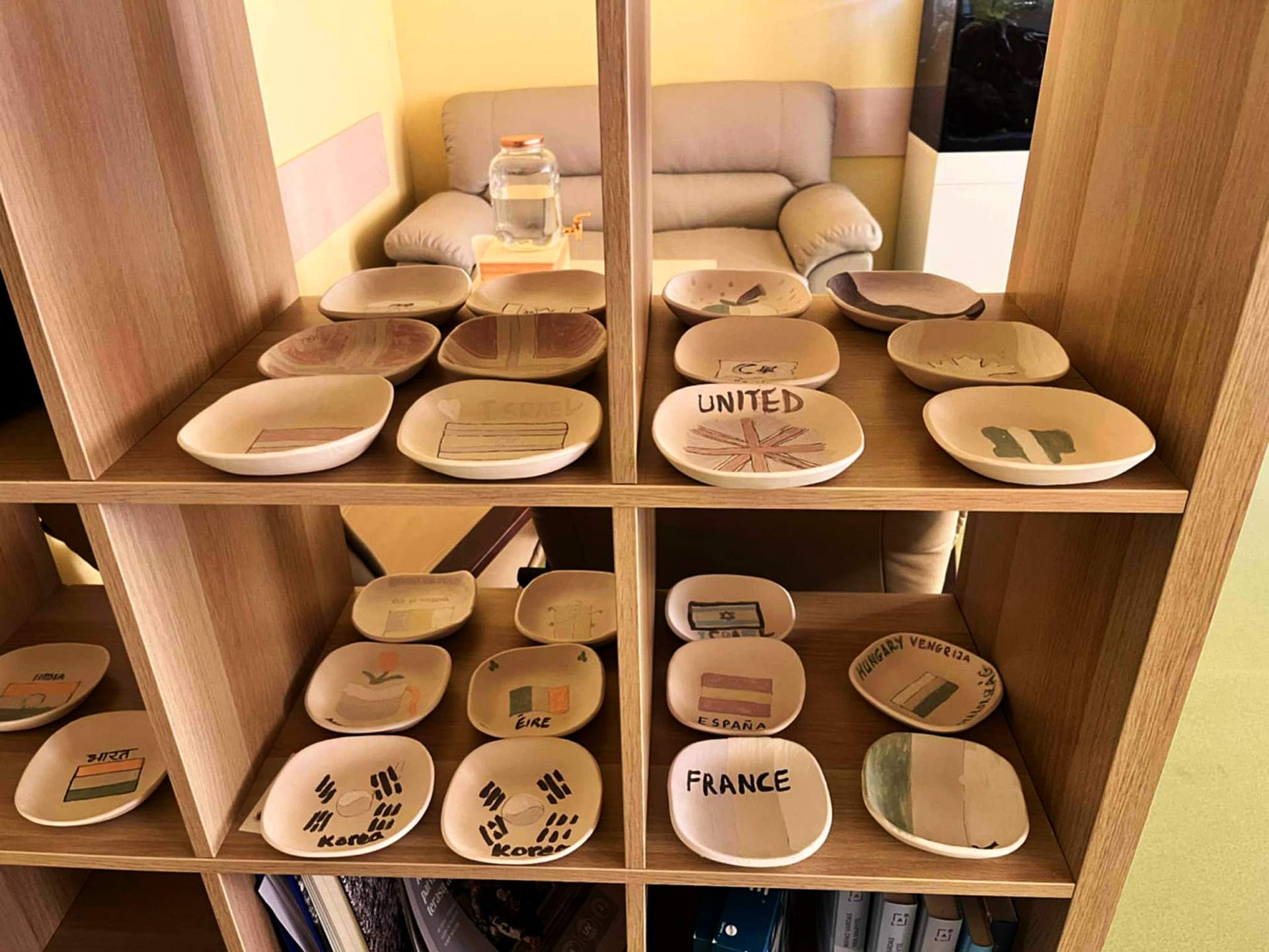 Kūrybinėje popietėje kartu dekoravo lankytojų pagamintas lėkšteles: kiekvienas ambasadorius jose piešė savo šalies vėliavą.